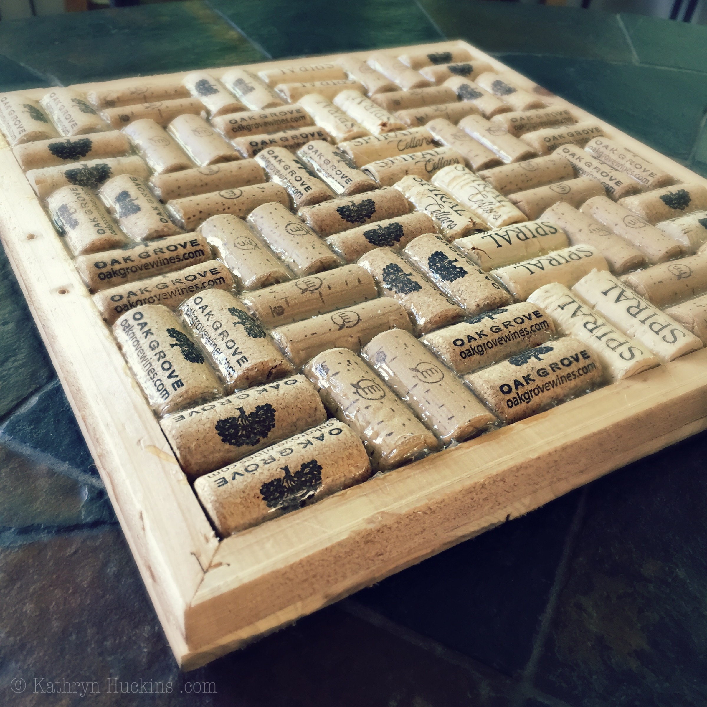Wood frame with wine corks glued in to make a hot pad or wall decoration.